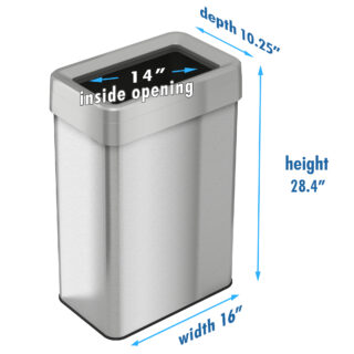 $114.53Add to cartITouchless 16 Gallon Dual-Deodorizer Open Top Trash Can, Rectangular Shape, Commercial Grade Stainless Steel, 61 Liter Open Garbage Can Dispose of trash quickly and easily with this large capacity, open top trash can. The slim, space-efficient design and wide open top make this the ideal trash can for busy stores, offices, lobbies, and homes.