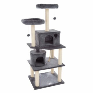 $44.15Add to cartThis cat tree is a great playground and comfortable bed for your furry friends. There is a higher perch with raised cushion edges for feline friends to rest and lounge. The dual condos create a sense of security and a quiet place for them to snooze and sleep. Each condo has two doors, convenient for them to come and go. three fully-wrapped scratching posts are designed for your furry pals to play and exercise their paws. The scratching posts help protect your furniture from sharp claws. Durable particleboard, natural sisal ropes, and cozy plush materials make sure that our luxury cat house has a long service life. To ensure safety, the corners of the bottom board, middle board, perch, and condos all are round in shape to protect your cats. Also, in the back of the middle board, there is an anti-toppling band that can be used for securing the cat tree to the wall safely.