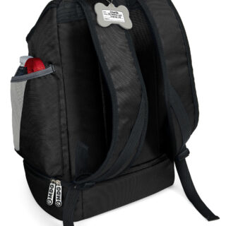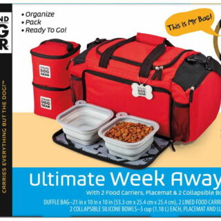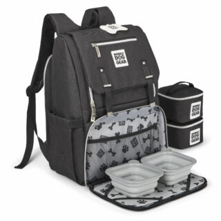 $84.25Add to cartMobile Dog Gear’s Ultimate Week Away Backpack will allow you to conveniently pack and organize your dog’s belongings for long or short trips. Our travel dog bag comes with two 5-cup lined food carriers for food and treats and two 2-cup collapsible silicone dog bowls that zips up with the placemat on the front of the bag. Features include: Side pockets, zippered inside mesh pocket, mesh pocket in front compartment, adjustable padded straps, built in waste bag dispenser, and large zippered drop-down storage compartment located in the back of the bag. The convenient waste bag dispenser is located at the bottom side of the bag, so you can simply reach around while walking and grab the waste bags and you are good to go. Our travel bag for dogs also meets airline carry-on requirements and features a bone shaped luggage ID tag and a luggage strap that fits over pull-up suitcase handles. The backpack is perfect for carrying essentials such as water bottles, dog toys, doggy waste bags, leash and can even fit a dog blanket! Our dog travel backpack has a polyester exterior that is resistant to tearing and ripping. The interior is fully lined and easy to keep clean. The backpack and food carriers are hand washable and the silicone bowls are top rack dishwasher safe.. Specifications Color: Black; Weight: 3.1 lbs; .