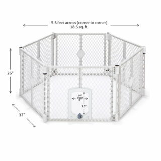 • “The Petyard Passage is a safe, portable containment area which features an exclusive swinging door for pets. The 9.5″” x 8″” door swings freely allowing your pet the freedom to come and go as they please. Want to contain your pet – no problem. The small door also locks for containment offering you peace of mind. Perfect for households with puppies or multiple pets. The Petyard Passage encloses up to 18.5 sq. ft. of space and is 26″” high. Increasing or reducing the size of your Petyard is easy, simply add or remove panels for multiple configurations for all stages and phases of your pets life. Adding a Two-Panel Extension (sold separately) will increase the size of your Petyard to 34.4 sq. ft. To make a cozy crate for a small dog or puppy, simply remove two panels. The Petyard Passage folds up easily and comes complete with a carry strap. Weather resistant and portable, the Petyard Passage can be used just about anywhere.”.