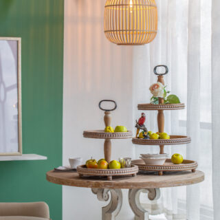 This 3 tiered tray takes the classic form of a pastry tower, and comes detailed with a wood bead trim.