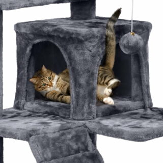 Car tree is made of high quality particle board with skin-friendly plush covering to keep your cats warmed and cozy,strengthened base with battens at the bottom to ensure its stability of the whole cat tree, anti-toppling fittings are included for double security. Specifications: Overall Dimension (Approx.): 20 x 20 x 52″(L x W x H) Big Condo(Approx.): 18 x 11 x 9.4″ (L x W x H) Small Condo(Approx.): 10.6 x 10.6 x 7.9″ (L x W x H) Round Platform Dia.: 10″ Max. Load: 55 LBs G.W.: 31.3 LBs