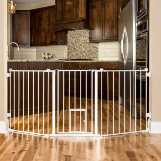 Carlson Maxi Walk Through Pet Gate: Easy assembly Stands 30 inches tall Small pet walk through One touch release safety locks Fits 51″ to 59″ doorways Easy lever style handle All-metal pet gate