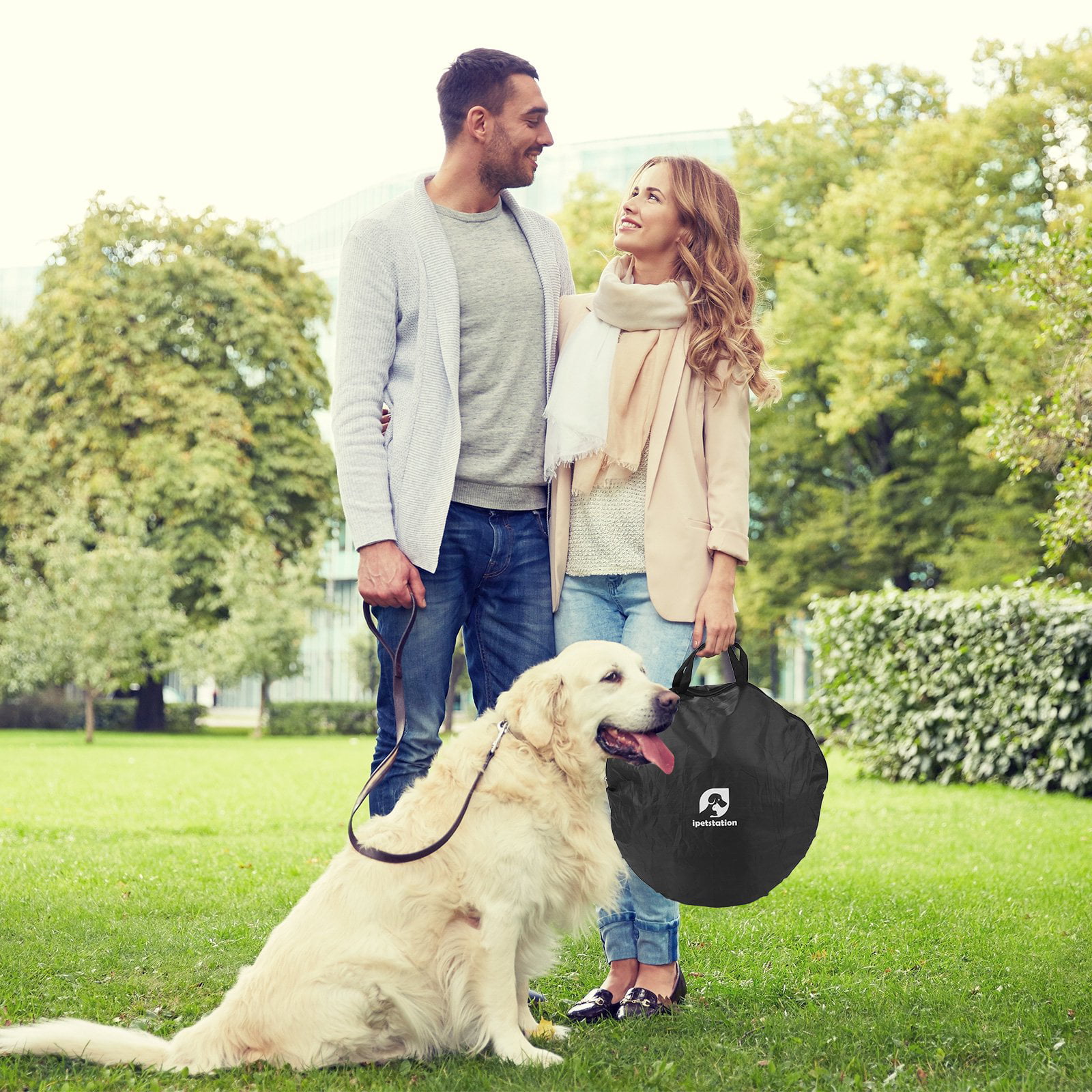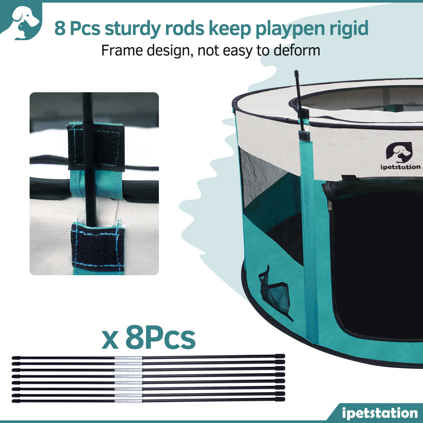 44in spacious playpen: 44″ /110cm diameter, 24″ /60cm in height, provide your pet with a comfortable and spacious play space. This pet playpen can accommodate several small and medium-sized dogs, and is the first choice for multi-dog families Pet playpen for dogs is a great alternative to a traditional kennel foldable and lightweight, making this ideal for traveling, camping, and easy mobility. It also folds flat when not in use for easy carrying and storing. Stable and firm: This dog Playard has 8 stake and 4 ground nails and is used for fixing and supporting, better in stability and not deformed. We also prepare extra 2 stakes for replacement. The front door rolls up and fastens out of the way providing easy in/out access for your pets, and a 360-degree open-mesh gives a clear view of the surrounding. The external bag can store other pet things such as pet toys. Great pet tent for rabbits, dogs, cats, and other small animals. It can be set up on your lawn, garden, or any room of your house, and its spacious round interior gives your pet more room to play, nap, hide or isolate. It is also worked as cat’s delivery room Specification: Item: Pet Playpen Brand: LAKWAR Color: White w/Blue Size:43.3 in Diameter Material:600D Oxford cloth + folded fiberglass rod + scratch resistant mesh Package: 1 X Playpen 1 X Foldable Bowl 1X Carry Bag 4X Gound nails 10X Stakes(2 for replacement) 1X Manual