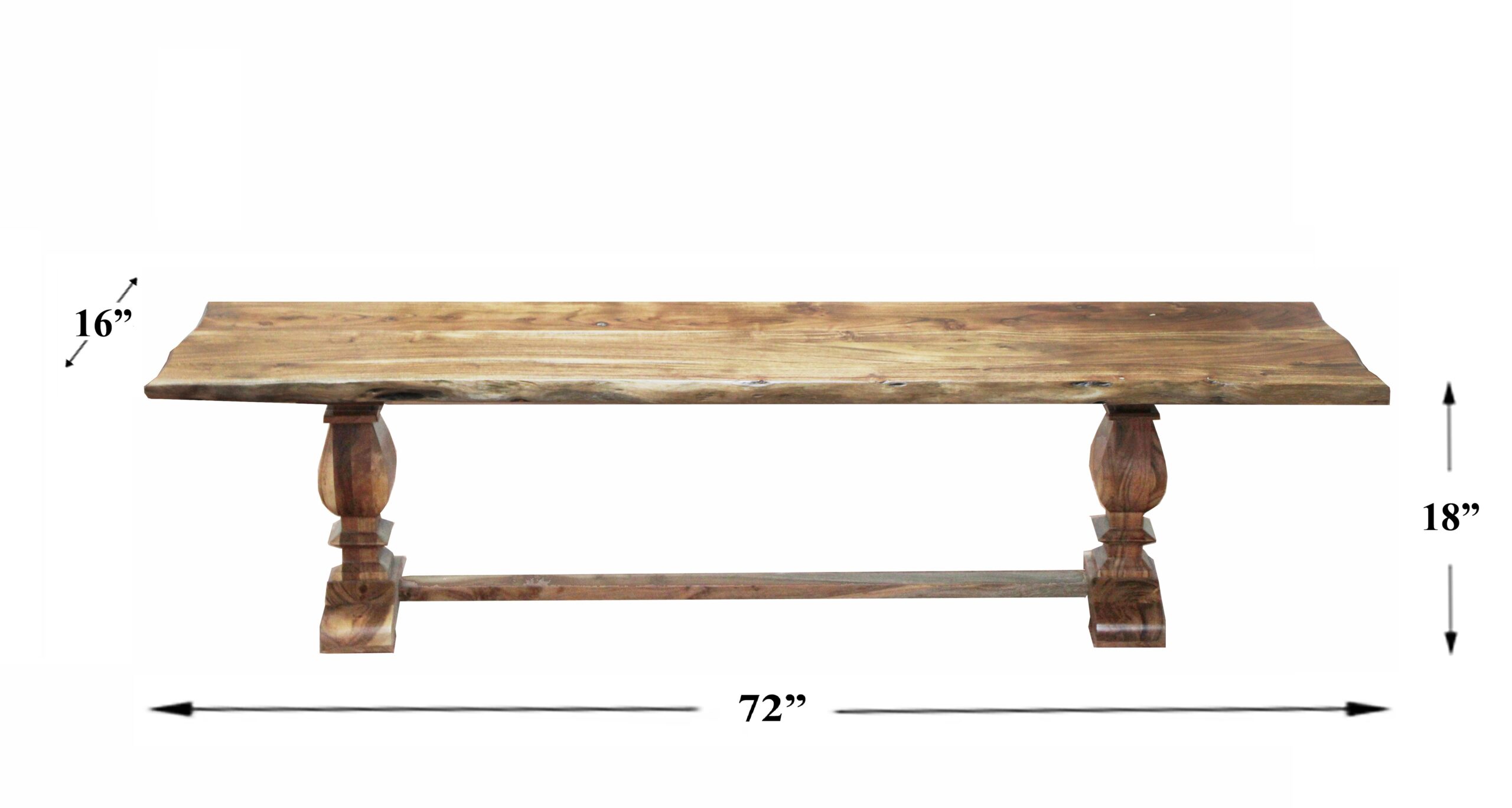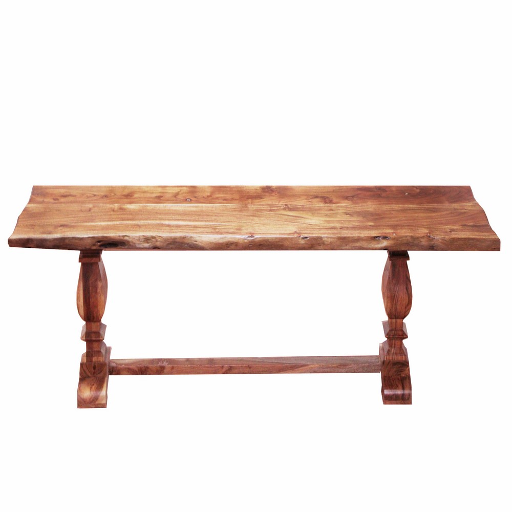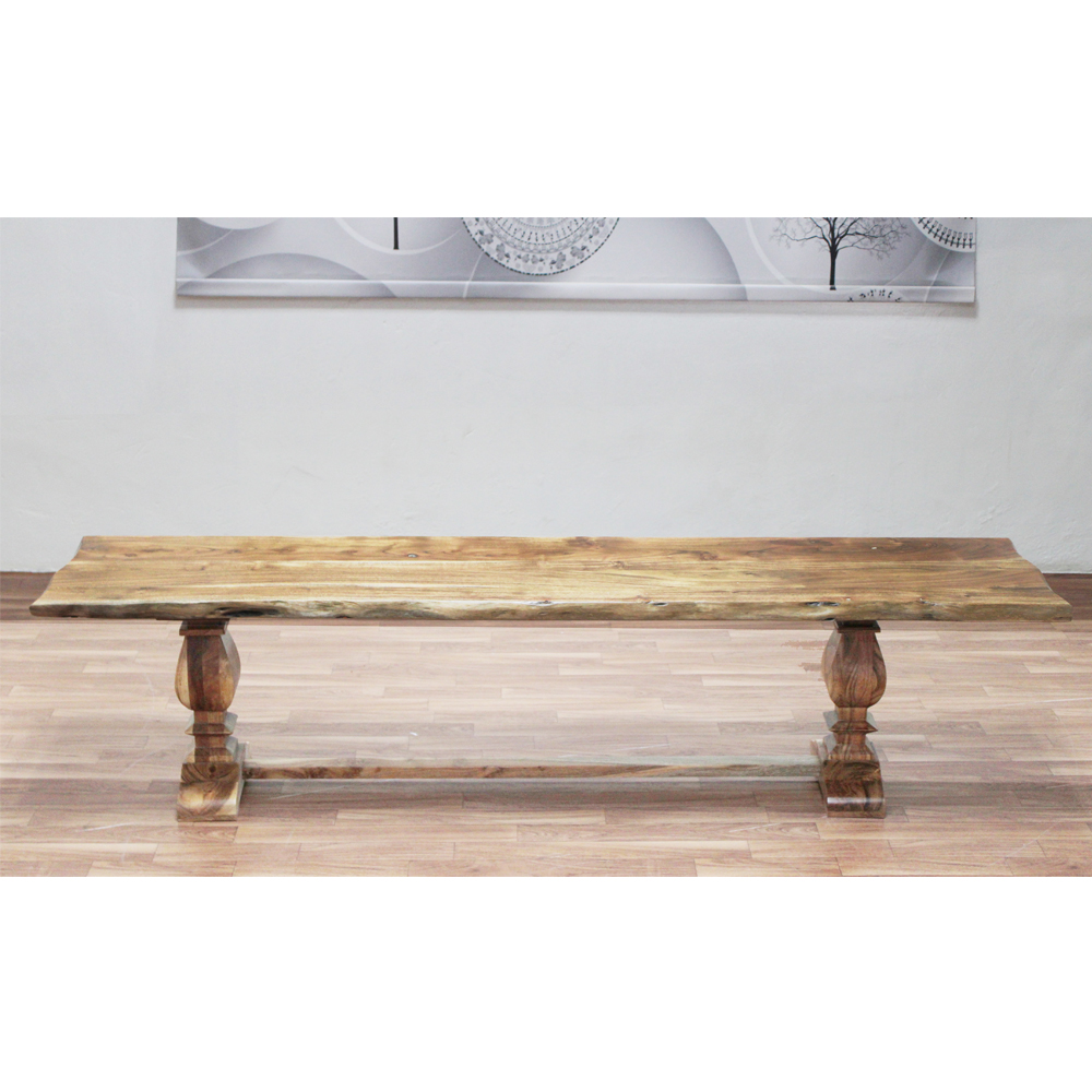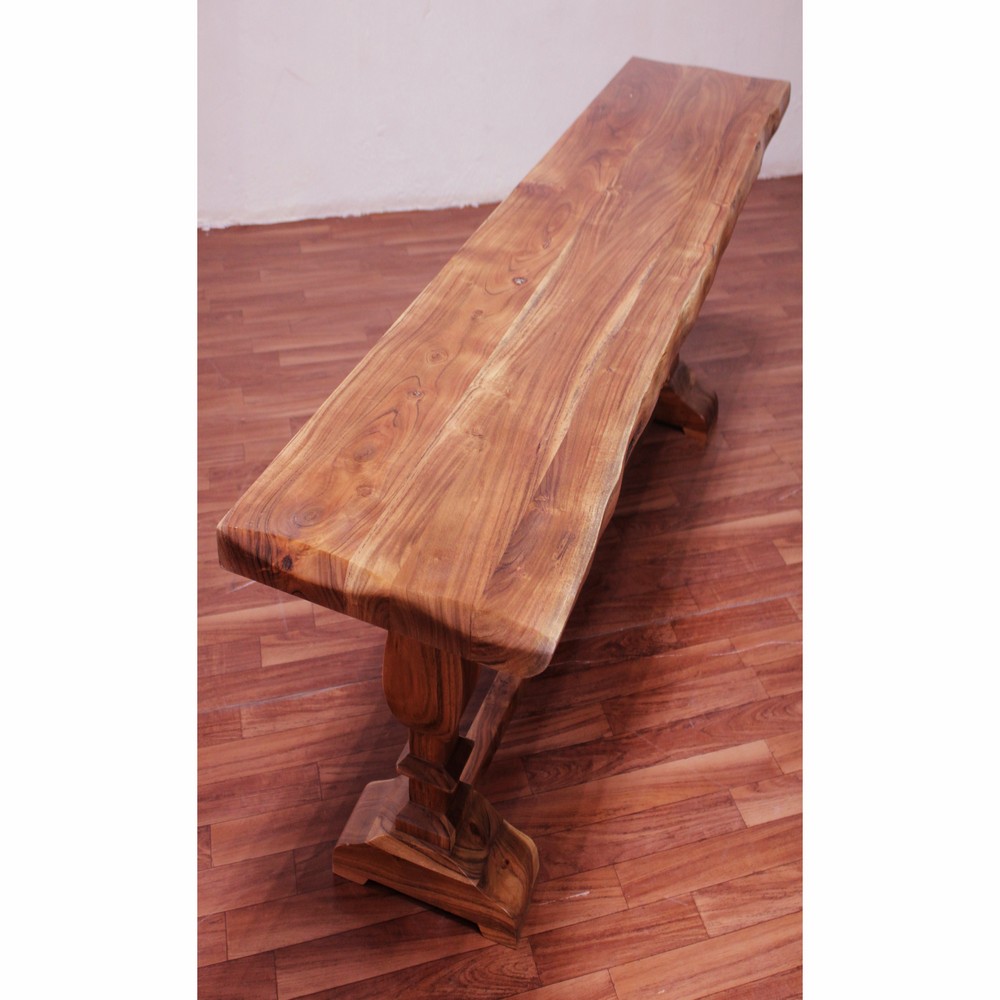 LR Home Live Edge Gloss Finish Brown / Chestnut Strong Wood Bench : Made of Acacia Wood with Lacquer Finish Features hand-finished glossing techniques that allows the natural grain to shine through. Comfortably seats 2 to 3 people. Natural variations of the wood make each piece unique. Wood top measures 1.25 inches in thickness. Wipe clean with a soft, dry cloth. Avoid harsh chemicals. Protect your furniture by avoiding direct sunlight. Periodically check hardware to ensure tightness. Small cracks and fissures may develop due to humidity and temperature. This is a natural and uncontrollable characteristic of solid wood furniture. Handmade in India of solid acacia wood. Please Note: The images may vary due to differences in computer monitors, some colors may vary slightly. Measures: 72 / Leg Length 4.5, 16 / Leg Width 11.5, 18.5/ Leg Height 17, 16 / Difference between legs 44 & Wood Top Thickness 1.5″