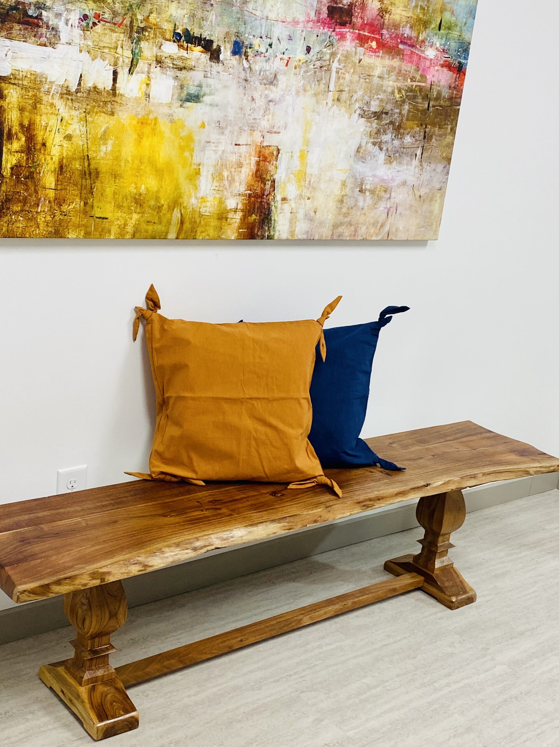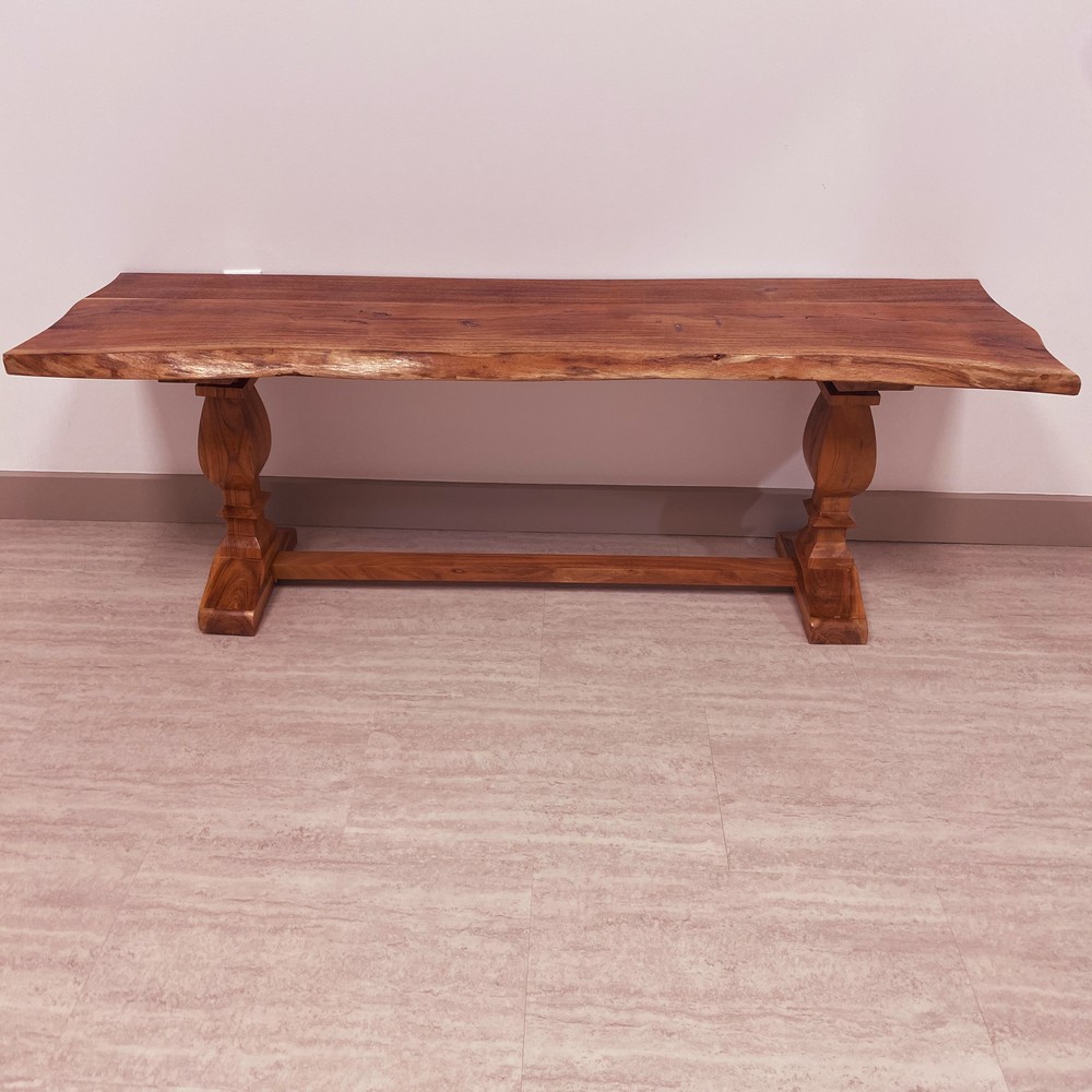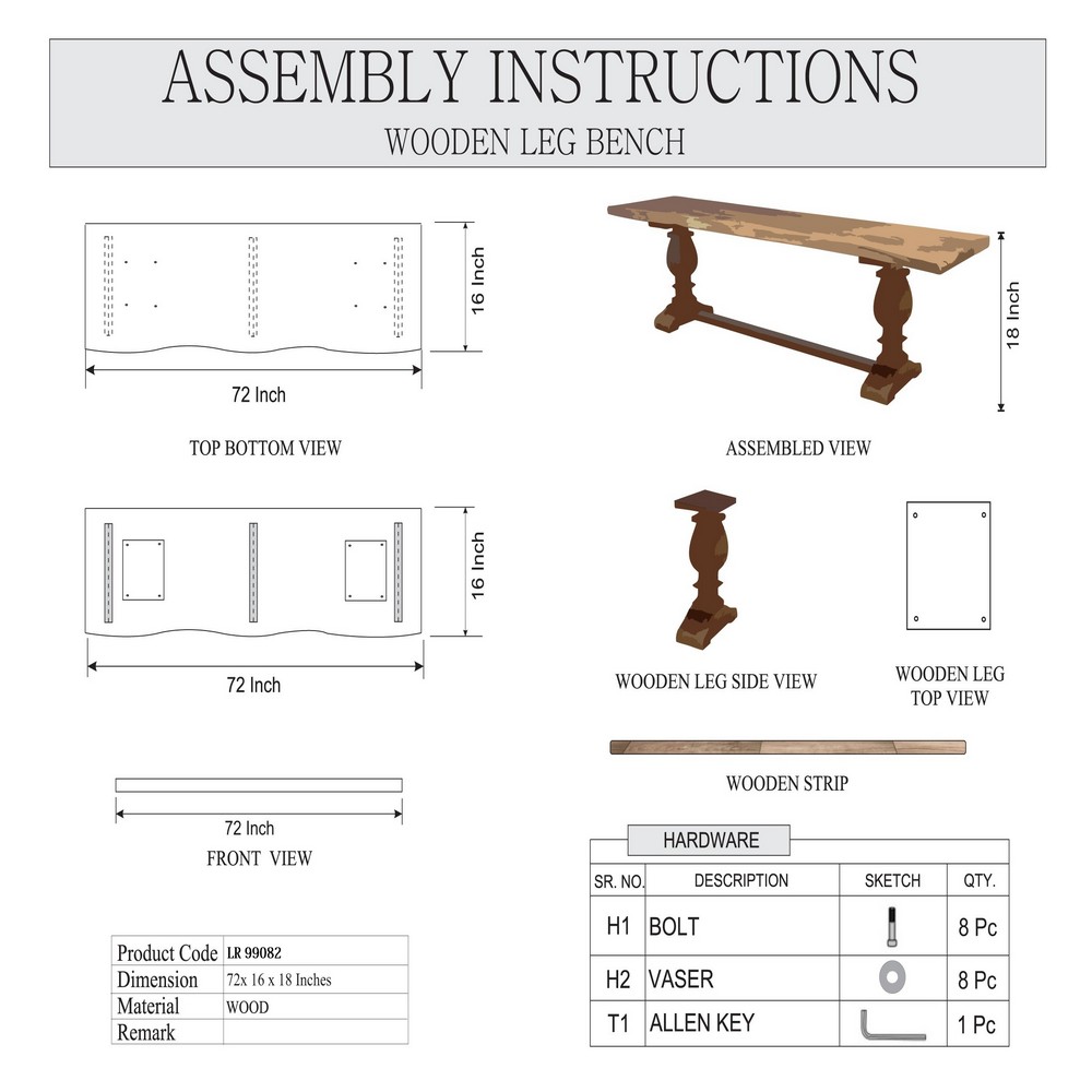LR Home Live Edge Gloss Finish Brown / Chestnut Strong Wood Bench : Made of Acacia Wood with Lacquer Finish Features hand-finished glossing techniques that allows the natural grain to shine through. Comfortably seats 2 to 3 people. Natural variations of the wood make each piece unique. Wood top measures 1.25 inches in thickness. Wipe clean with a soft, dry cloth. Avoid harsh chemicals. Protect your furniture by avoiding direct sunlight. Periodically check hardware to ensure tightness. Small cracks and fissures may develop due to humidity and temperature. This is a natural and uncontrollable characteristic of solid wood furniture. Handmade in India of solid acacia wood. Please Note: The images may vary due to differences in computer monitors, some colors may vary slightly. Measures: 72 / Leg Length 4.5, 16 / Leg Width 11.5, 18.5/ Leg Height 17, 16 / Difference between legs 44 & Wood Top Thickness 1.5″