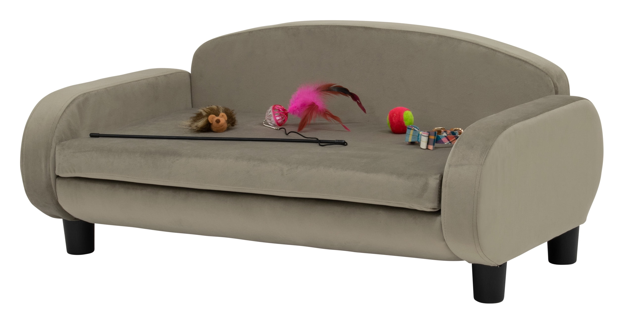 The Paws & Purrs Pet Sofa Bed is the perfect sleek lounger for your pet. Combining the best features of a pet bed and a sofa, the miniaturized modern cat and dog couch design blends perfectly with your home’s dcor. Cat furniture and dog beds have never looked more stylish. With plush cushioning and elevated edges, this couch pet bed provides a cozy and secure sleeping space for your cat or small dog, ensuring they get a restful and rejuvenating sleep. The Pet Sofa Bed comes with a removable, machine-washable cover for easy cleaning. Your cool cat or hip pooch can lay and stretch comfortably on its 29-inch wide, 3″ thick mattress. Not recommended for aggressive chewers.