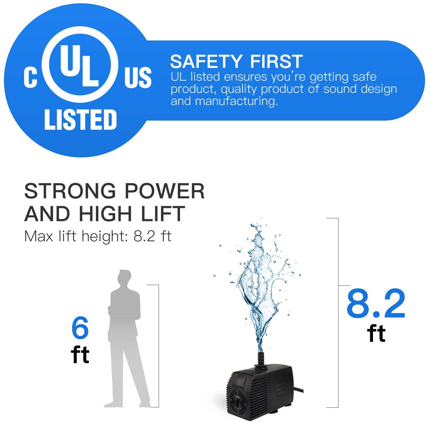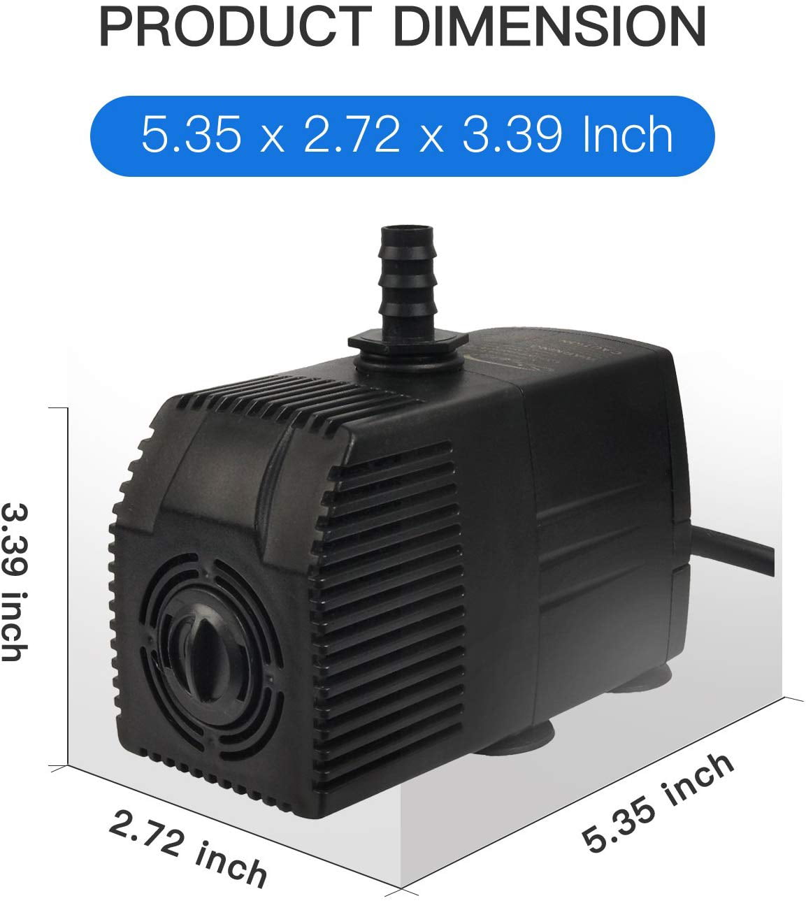 PRE-FILTER INCLUDED – Pre-filter on the intake prevents debris from entering your pump and extend the life of your pump. An adjustable knob make it easy to control the water flow rate. Max flow rate: 400GPH, Max Lift Height 8.2ft DURABLE QUALITY – Our Polished Aluminum Oxide Ceramic Impeller Shaft insures long pump life because it is non-corrodible and more than 3 times as hard as stainless steel. Epoxy Resin Encasement of key internal motor components prevents unwanted conductivity and corrosion of metal parts SAFE & EASY – ETL Listed. Safe for fish with no exposed copper. Easy to clean with no tools required to disassemble and clean impeller. Our Electric Cord is waterproof, 18# gauge copper wire, molded plug with ground, heavy duty flexible vinyl jacket, resists oil/grease/moisture, abrasion resistant and very good flexibility at all temperatures 3 THREADED NOZZLES(0.51in, 0.62in, 0.75in) – Threaded fittings make it more stable. 4 SUCTION CUP at bottom and 15′ CORD, so you can stick it on the right side of the aquarium, either vertically or horizontally. Dimensions: 5.35″ x 2.72″ x 3.39″ LOW NOISE & VERSATILE – Circulate and aerate the water, making it more attractive to your fish or turtles. This submersible pump is perfect for aquarium, fountains, spout and hydroponic systems This is not a food-grade pump. Do not use in the production of food for human consumption