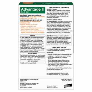 $72.75Add to cartDeliver total flea protection to your cat or kitten with Advantage II Small Cat. This vet-recommended, topical treatment and prevention formula kills adult fleas, flea larvae, and flea eggs on contact within 12 hours of application – meaning fleas can be eliminated before they bite or lay new eggs. Effectively break the flea life cycle, control existing flea and lice infestations, and prevent further infestations with one simple application. Advantage II Small Cat flea protection is effective on both indoor and outdoor cats. Your cat should be at least 8 weeks old and weigh 5-9 lbs. to use Advantage II Small Cat.