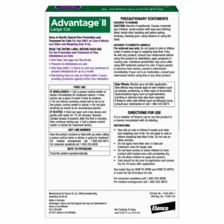 $80.00Add to cartDeliver total flea protection to your cat or kitten with Advantage II Large Cat. This vet-recommended, topical treatment and prevention formula kills adult fleas, flea larvae, and flea eggs on contact within 12 hours of application – meaning fleas can be eliminated before they bite or lay new eggs. Effectively break the flea life cycle, control existing flea and lice infestations, and prevent further infestations with one simple application. Advantage II Large Cat flea protection is effective on both indoor and outdoor cats. Your cat should be at least 8 weeks old and weigh over 9 lbs. to use Advantage II Large Cat.